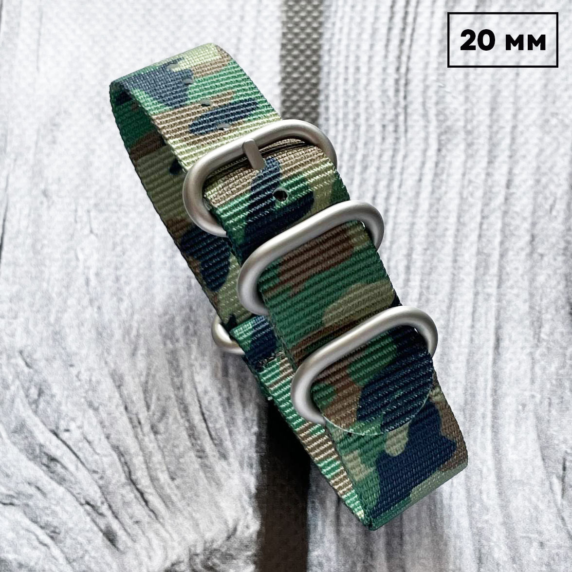 Ремінь годинника Nato Camo Woodland шириною 20 мм виготовлений з нейлону, має камуфляжний колір. Загальна довжина ремінця складає 280 см, вага - 25 г. Застібка виконана у сріблястому кольорі. Ремінь розрахований на чоловіків та сумісний з годинниками з кріпленням для ремінка 20 мм. Виробництво - Китай, бренд - NATO. Тип кріплення - ремінок, тип застібки - пряжка.