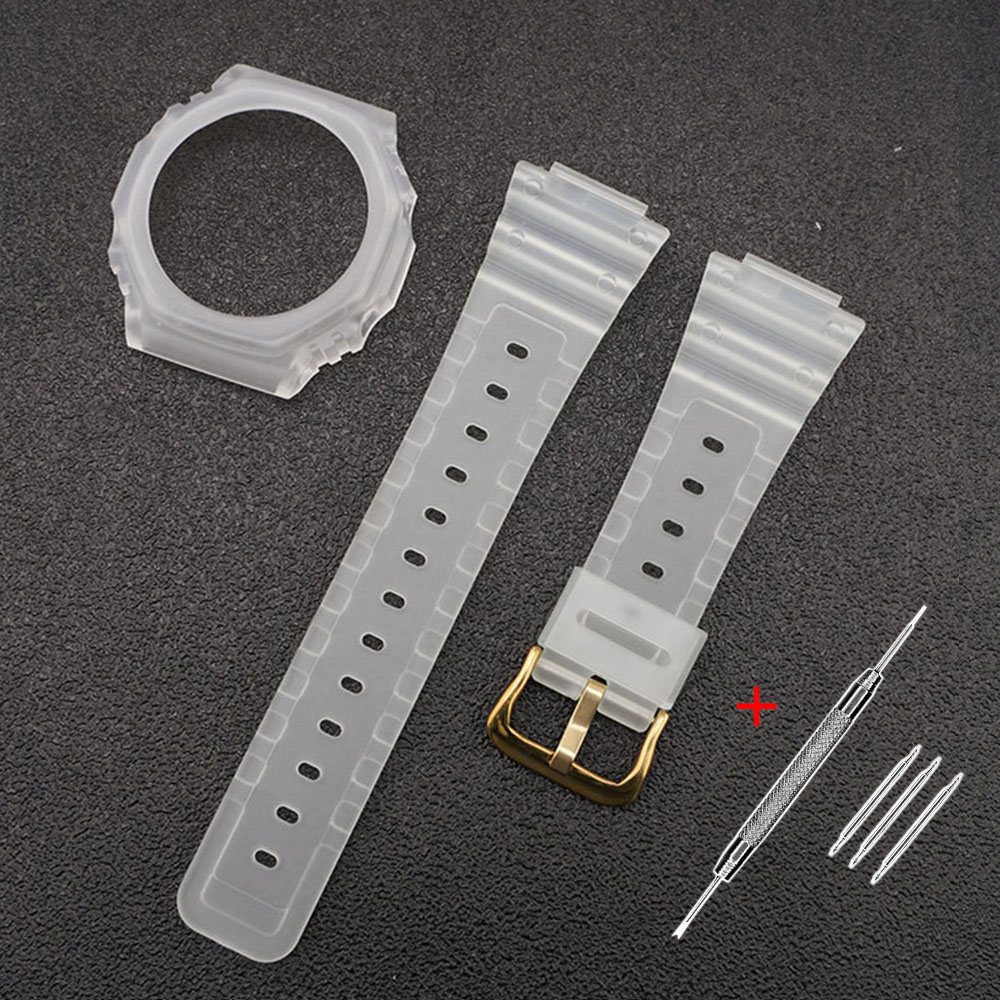 Ремінець та безель (рант) для годинників Casio G-Shock GA-2100 Transl GD. Виготовлений з каучуку, має напівпрозорий колір і золотисту застібку. Довжина ремінця - 20,1 см, ширина - 16 мм. Підходить для чоловіків, жінок та унісекс. Гарантія - 1 місяць. Вага - 43 г. Сумісний з моделями GA-2100 та GA-2110.