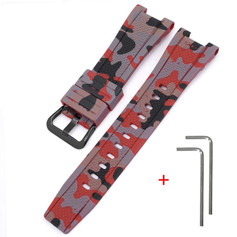 Ремінець для годинників Casio G-Shock моделей GST-W100G, W110, W130L, W300, W300G, S110, S100G, S300, S300G, S210B, B100, 410G. Виготовлений з полімеру, має червоний камуфляжний колір. Довжина ремінця складає 21,2 см, ширина - 23 см. Тип застібки - пряжка чорного кольору. Підходить для чоловіків, жінок та внісекса. Гарантія - 1 місяць. Вага ремінця - 18 г. Країна виробника - Китай.