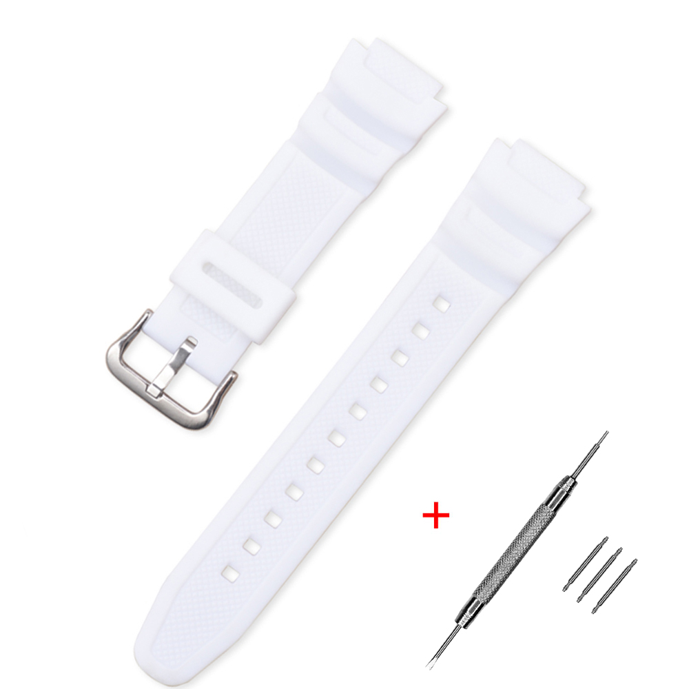 Ремінець для годинників Casio G-Shock моделей W-S200H/215/216H/735H/800H, SGW-300H/400H/500H, AQ-S800W/S810W, AE-1000W/1200/1300, MRW-200H, F-108WH. Виконаний з поліуретану, має білий колір, довжину 21,6 см та ширину 18 мм. Застібка сріблястого кольору, тип кріплення - пряжка. Спроектований для чоловіків, жінок та унісекс. Гарантія 1 місяць. Вага ремінця становить 24 г. Виробництво - Китай.