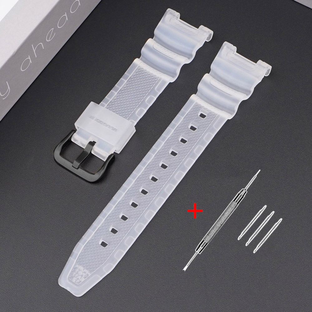 Ремінець для годинника Casio SGW-100 виконаний з полімерного матеріалу, має напівпрозорий колір і застібку сріблястого відтінку. Довжина ремінця складає 20,6 см, ширина — 24 мм. Підходить для жіночих, чоловічих та унісекс моделей. Має класичну форму з двох половинок та литий тип браслету. Гарантія на продукт — 1 місяць. Вага ремінця становить 24 г. Виробництво — Китай.