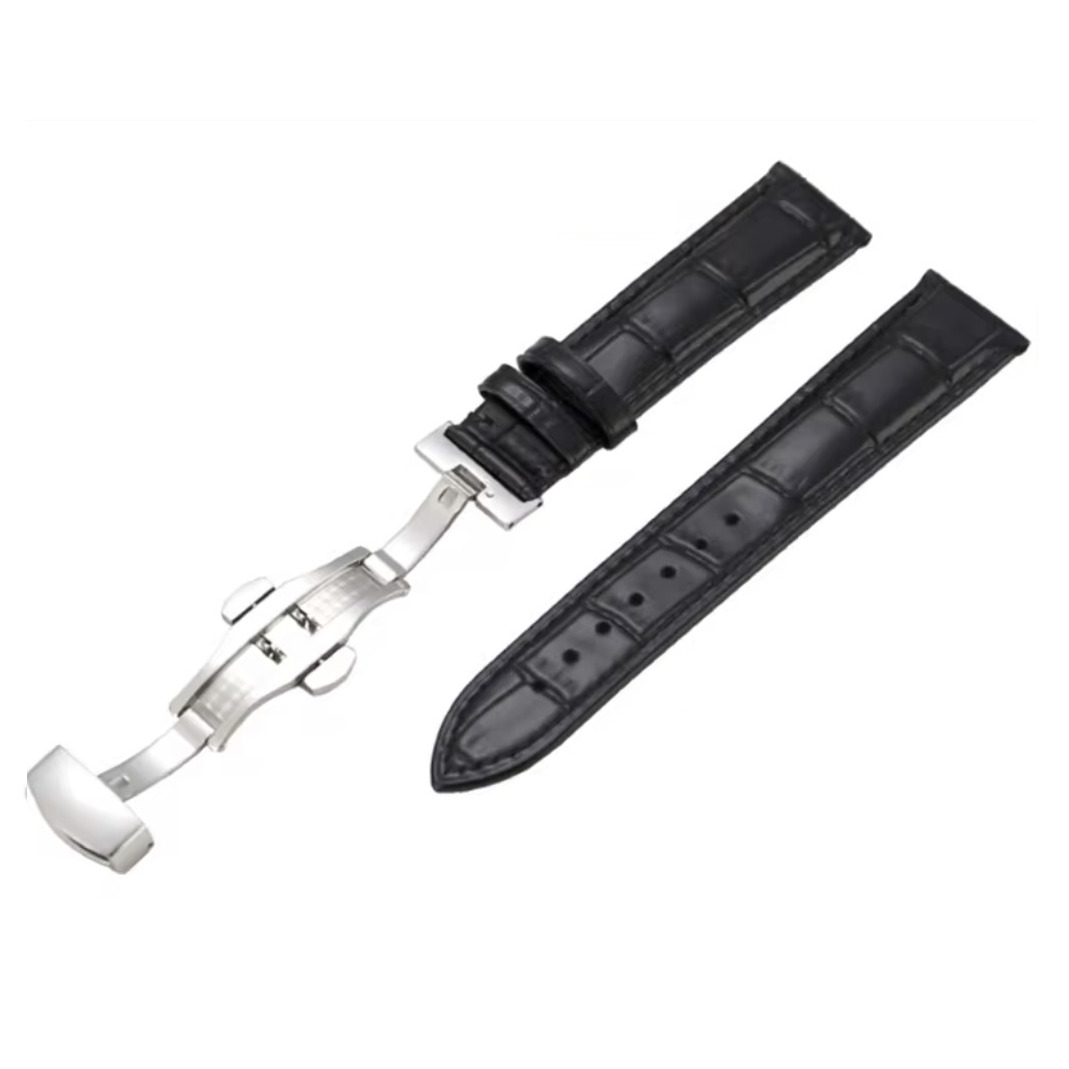 Це преміальний ремінець зі шкіри вищої проби на кліпсовій застібці. Ремінець не боїться води (незначне потрапляння), виконаний з високоякісної приємної для руки шкіри та підійде на будь-який годинник 22 розміру.