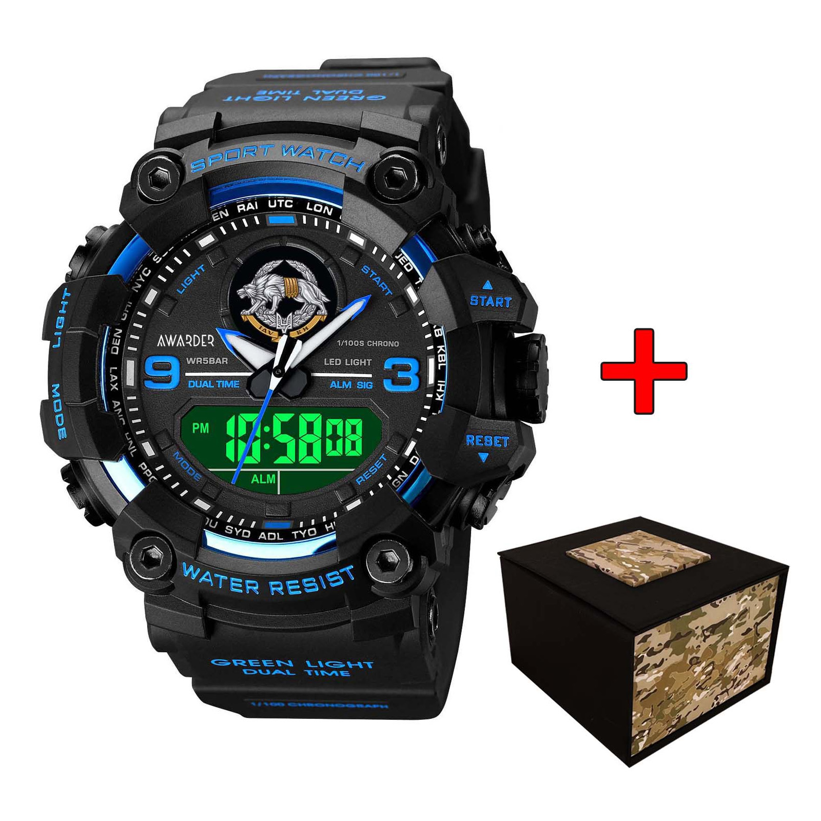 Awarder, механізм Кварцовий, корпус 54 х 58, матеріали Полімер / Каучук, колір Чорний, форма Кругла, стиль Спортивний, Армійський, індикація Стрілочно-електронний, тип кріплення Ремінець, водозахист 50 м, скло Полімерне
