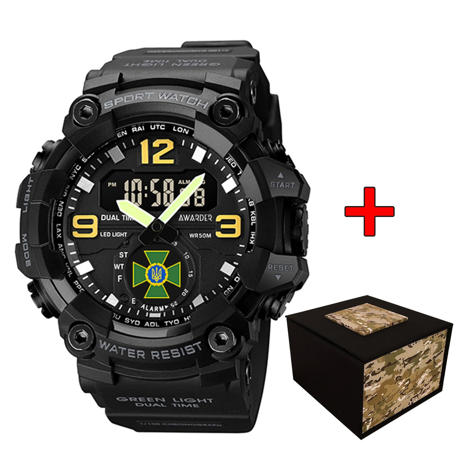 Awarder, механізм Кварцовий, корпус 54 х 58, матеріали Полімер / Каучук, колір Чорний, форма Кругла, стиль Спортивний, Армійський, індикація Стрілочно-електронний, тип кріплення Ремінець, водозахист 50 м, скло Полімерне