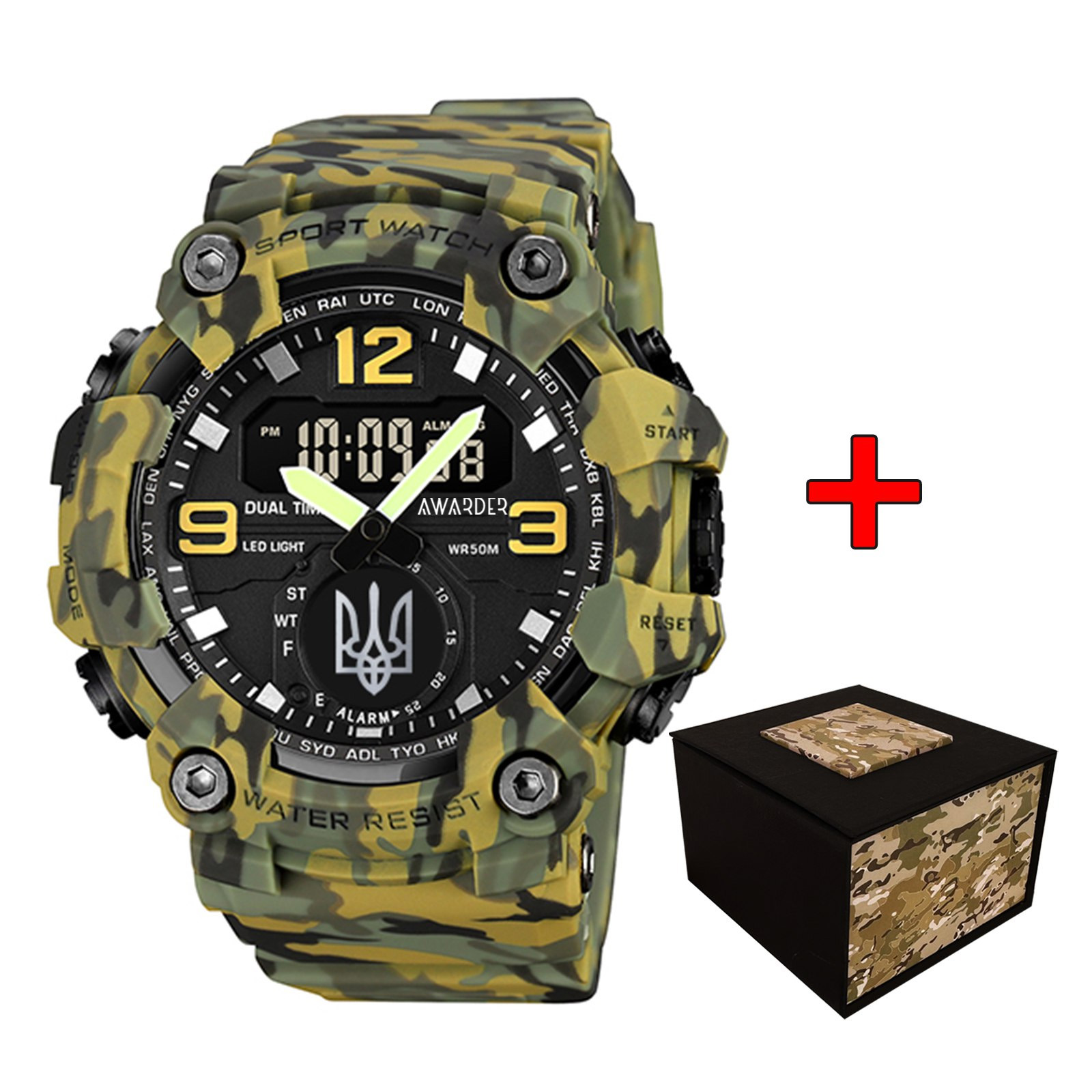 Awarder, механізм Кварцовий, корпус 54 х 58, матеріали Полімер / Каучук, колір Камуфляж, форма Кругла, стиль Спортивний, Армійський, індикація Стрілочно-електронний, тип кріплення Ремінець, водозахист 50 м, скло Полімерне