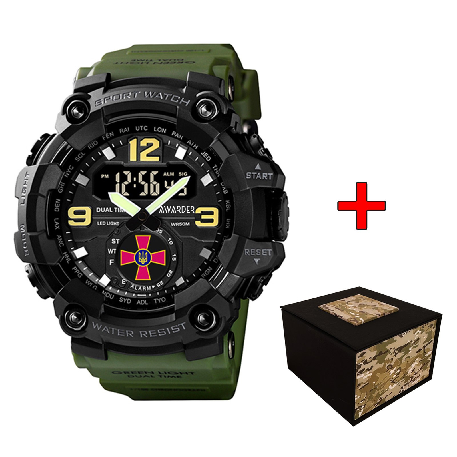 Awarder, механізм Кварцовий, корпус 56 х 56, матеріали Полімер / Каучук, колір Чорний / Зелений, форма Кругла, стиль Спортивний, Армійський, індикація Стрілочно-електронний, тип кріплення Ремінець, водозахист 50 м, скло Полімерне