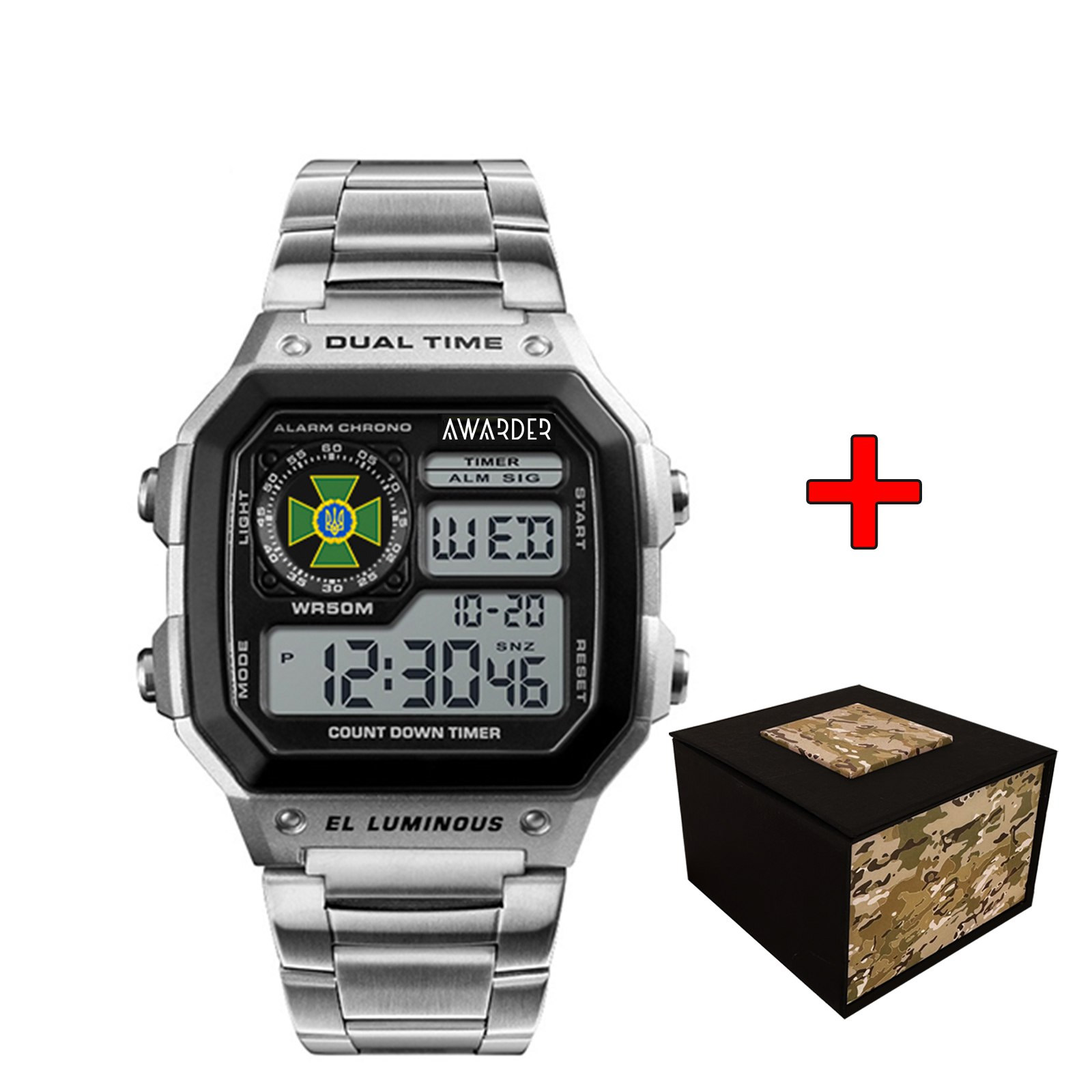Awarder, механізм Електронний, корпус 45 х 43, матеріали Полікарбонат / Нержавіюча сталь, колір Сріблястий, форма Квадратна, стиль Спортивний, Сasual, індикація Електронний, тип кріплення Браслет, водозахист 50 м, скло Полімерне