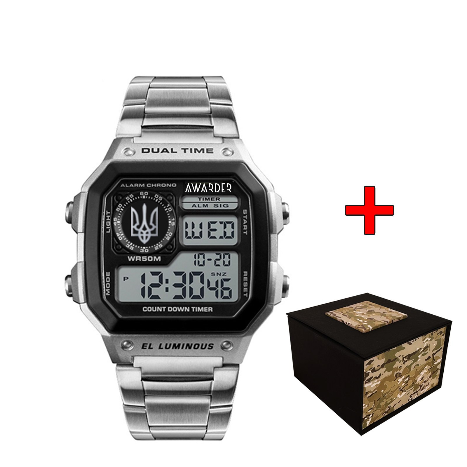 Awarder, механізм Електронний, корпус 45 х 43, матеріали Полікарбонат / Нержавіюча сталь, колір Сріблястий, форма Квадратна, стиль Спортивний, Сasual, індикація Електронний, тип кріплення Браслет, водозахист 50 м, скло Полімерне