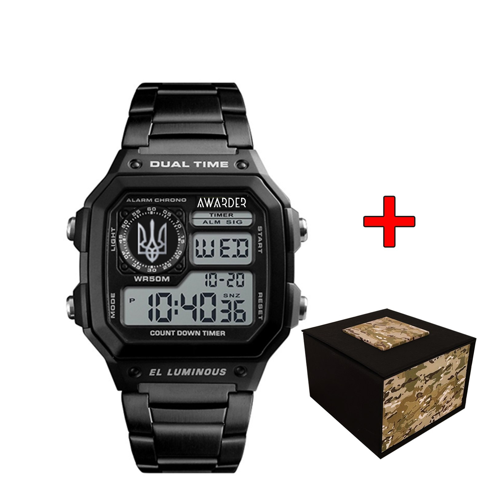 Awarder, механізм Електронний, корпус 45 х 43, матеріали Полікарбонат / Нержавіюча сталь, колір Чорний, форма Квадратна, стиль Спортивний, Сasual, індикація Електронний, тип кріплення Браслет, водозахист 50 м, скло Полімерне