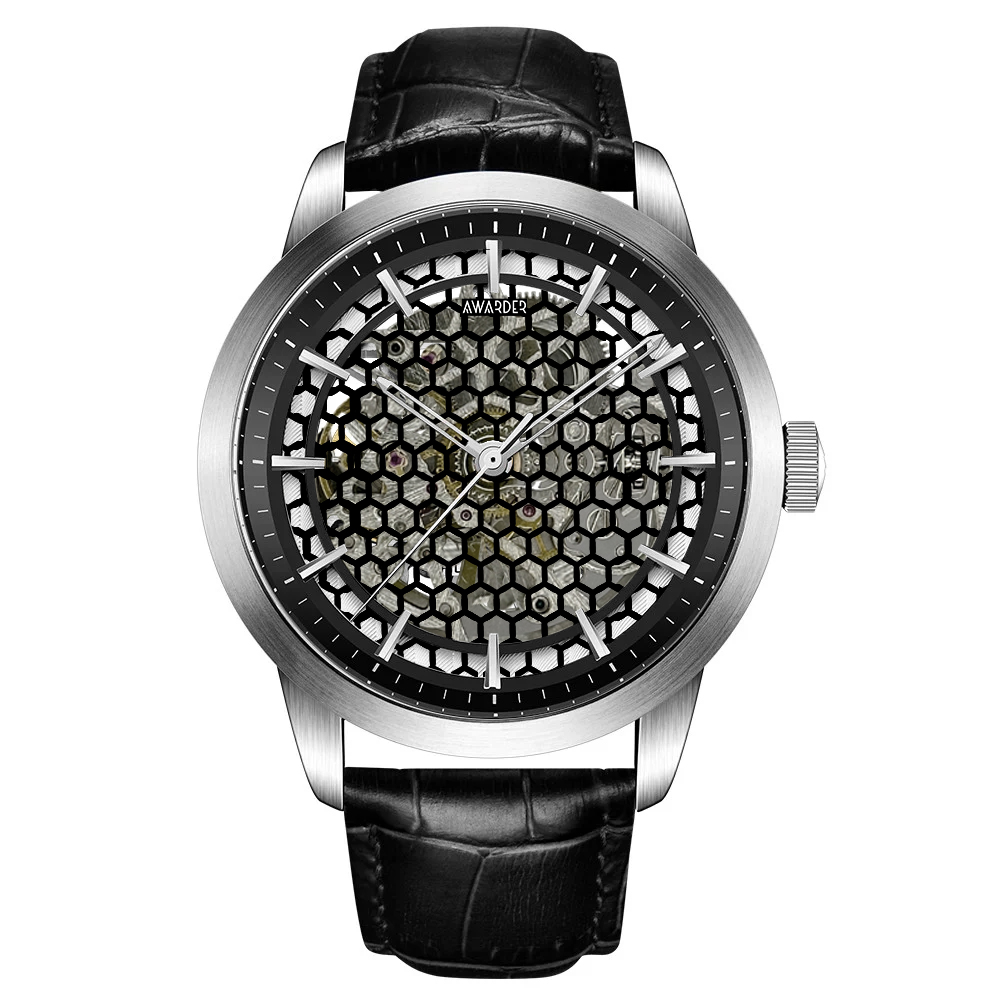 Awarder, механізм Механічний з автопідзаводом, корпус 48 х 43, матеріали Сталь / Шкіра, колір Сріблястий / Чорний, форма Кругла, стиль Сasual, Класичний, індикація Стрілочний, тип кріплення Ремінець, водозахист 30 м, скло Сапфірове