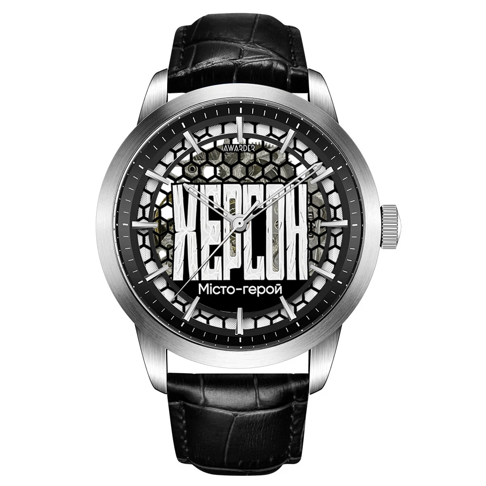 Годинник Awarder 043 Херсон I Міста Герої Розкрийте свою індивідуальність з годинником Awarder 043 Херсон I, який поєднує в собі елегантний класичний стиль та сучасну функціональність. Цей чоловічий годинник порадує вас своєю високою якістю виконання — корпус виготовлений з нержавіючої сталі, а ремінець з натуральної шкіри, що робить його не тільки стильним, а й комфортним у носінні. З водонепроникністю до 30 метрів він стане вашим вірним супутником у будь-яких умовах. Сапфірове скло надійно захищає циферблат, а механічний механізм з автопідзаводом забезпечує точність показів. Годинник має круглу форму та індикацію годин, хвилин і секунд, що робить його зручним для щоденного використання. Стильний сріблястий корпус у поєднанні з чорним ремінцем створює елегантний образ, який гармонійно вписується як в casual, так і в класичний стиль. З Awarder 043 Херсон I ви завжди будете на часі, несучи в собі частинку української майстерності. Годинник має гарантію 24 місяці, що підтверджує його високу якість та надійність. Не упустіть можливість стати власником цього унікального аксесуара!