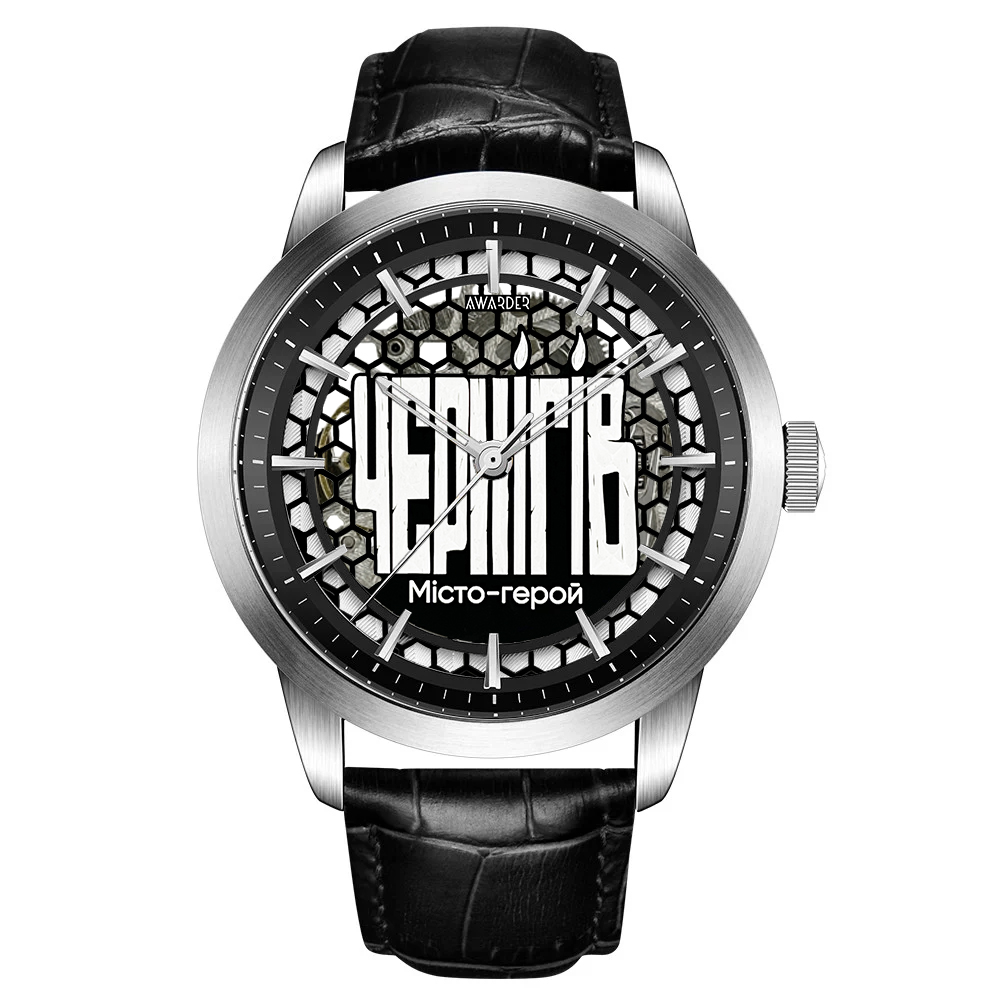 Awarder, механізм Механічний з автопідзаводом, корпус 48 х 43, матеріали Нержавіюча сталь / Шкіра, колір Сріблястий / Чорний, форма Кругла, стиль Сasual, Класичний, індикація Стрілочний, тип кріплення Ремінець, водозахист 30 м, скло Сапфірове