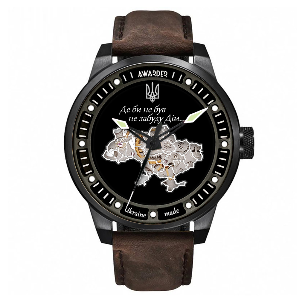 Awarder, механізм Механічний з автопідзаводом, корпус 47 х 47, матеріали Метал / Шкіра, колір Чорний / Коричневий, форма Кругла, стиль Сasual, Класичний, індикація Стрілочний, тип кріплення Ремінець, водозахист 100 м, скло Hardlex crystal