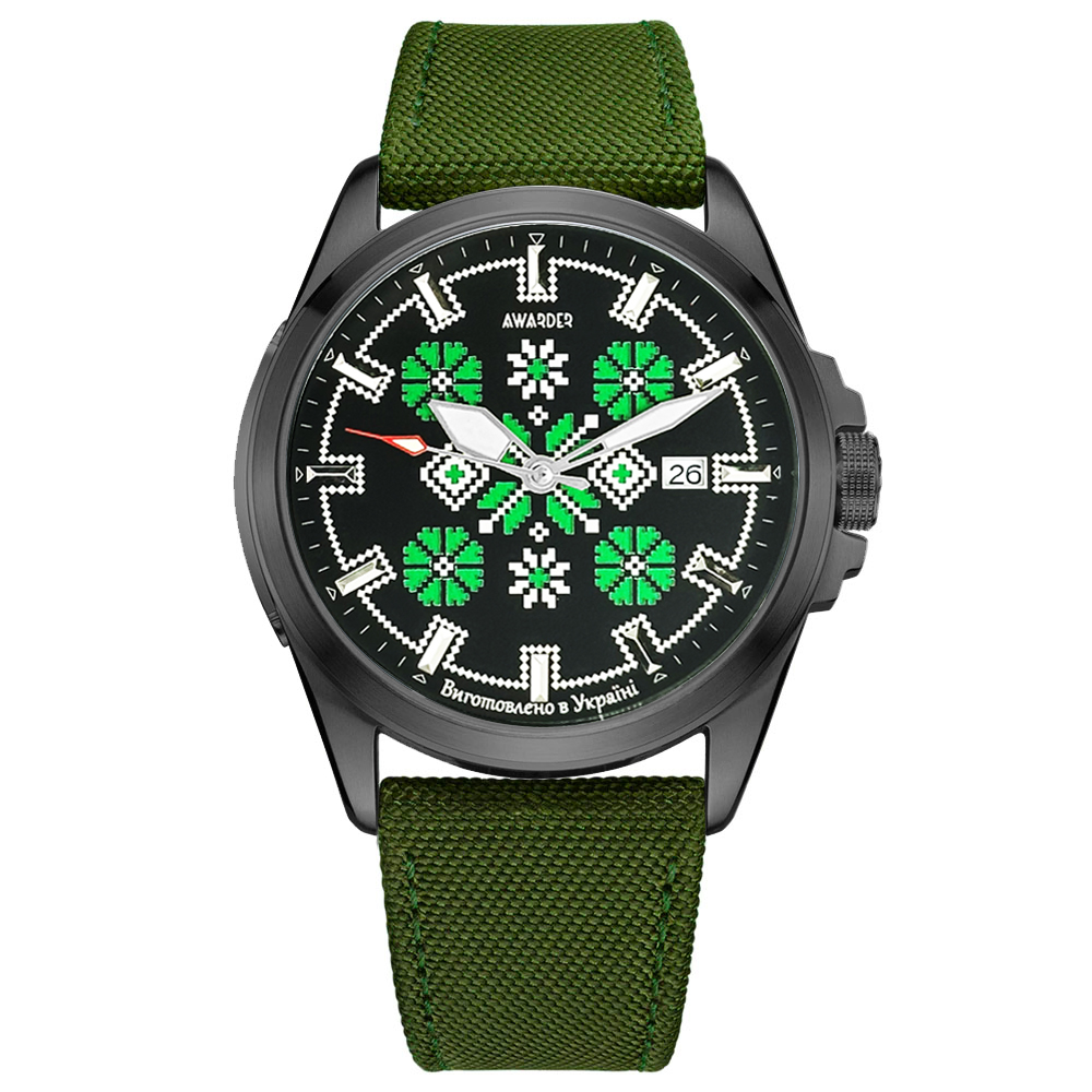 Представляємо вам годинник Awarder Embroidery Black-Green Green Automatic 10ATM — елегантний та стильний аксесуар для сучасного чоловіка. Його корпус виготовлений із нержавіючої сталі, а ремінець поєднує шкіру та нейлон, що забезпечує комфорт та надійність. Цей годинник поєднує в собі класичний та casual стилі, завдяки чому він стане чудовим доповненням до будь-якого вбрання. З водонепроникністю до 100 метрів (10ATM) ви можете не турбуватися про дощ або легкі водні процедури. Сапфірове скло забезпечує високу стійкість до подряпин, а механічний механізм з автопідзаводом гарантує точність у вимірюванні часу. Годинник оснащений функцією календаря та люмінесцентною підсвіткою, що робить його ще більш практичним у повсякденному використанні. Радує також українське походження бренду Awarder, що підкреслює якість та традиції нашої країни. Стильний чорний корпус і зелений ремінець ідеально доповнюють один одного, а кругла форма і індикатори для годин, хвилин, секунд та дати надають годиннику сучасного вигляду. Не втрачайте можливість додати до свого образу цей унікальний годинник, гарантуючи собі стиль і функціональність на протязі всього дня! Гарантія на годинник становить 12 місяців.