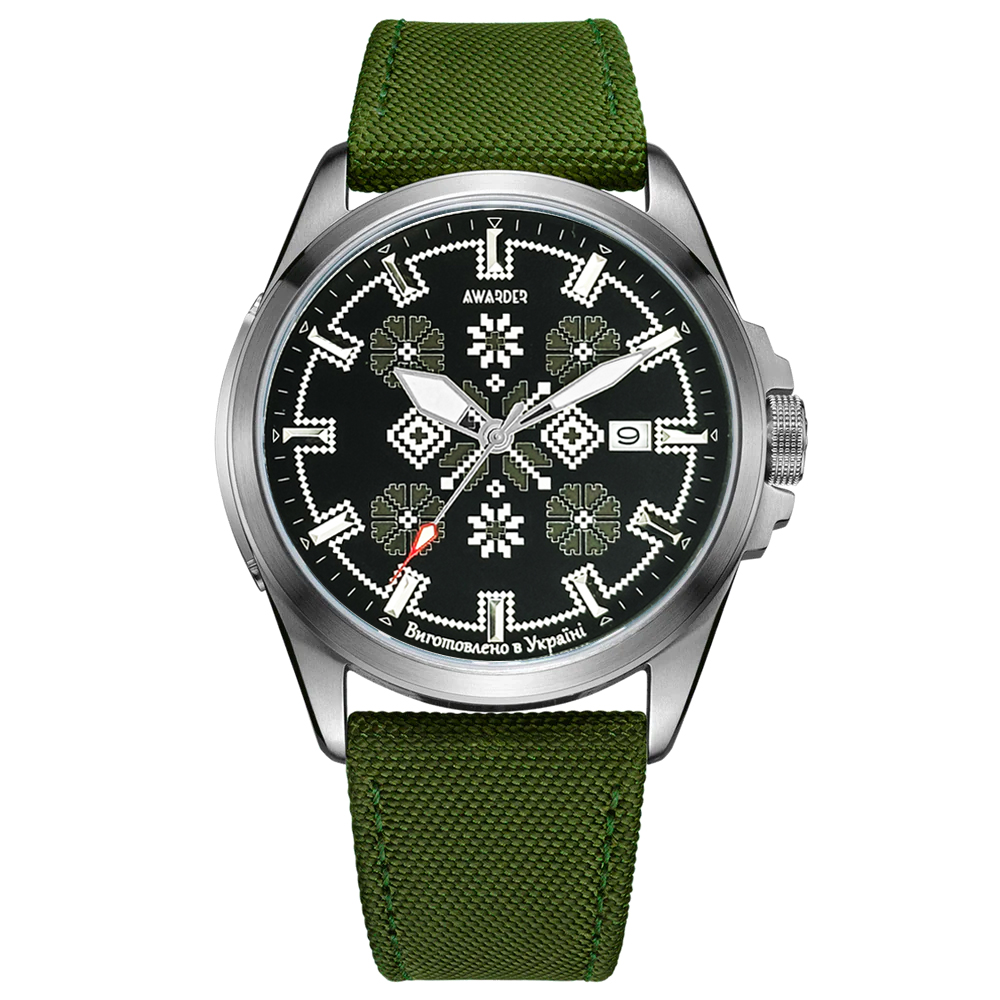 Awarder, механізм Механічний з автопідзаводом, корпус 43 х 43, матеріали Нержавіюча сталь / Шкіра + Нейлон, колір Сріблястий / Зелений, форма Кругла, стиль Сasual, Класичний, індикація Стрілочний, тип кріплення Ремінець, водозахист 100 м, скло Сапфірове
