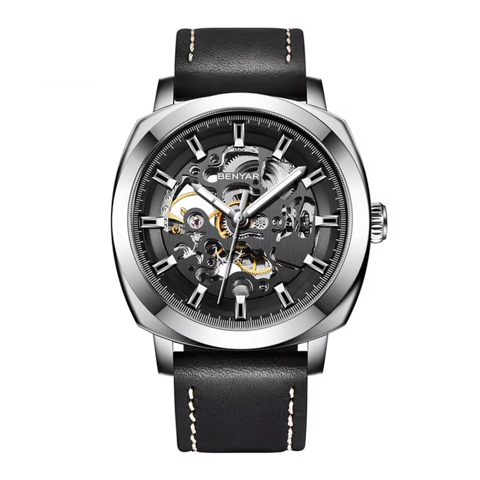 Benyar, механізм Механічний з автопідзаводом, корпус 38 х 38, матеріали Метал / Шкіра, колір Сріблястий / Чорний, форма Кругла, стиль Сasual, Класичний, індикація Стрілочний, тип кріплення Ремінець, водозахист 50 м, скло Мінеральне