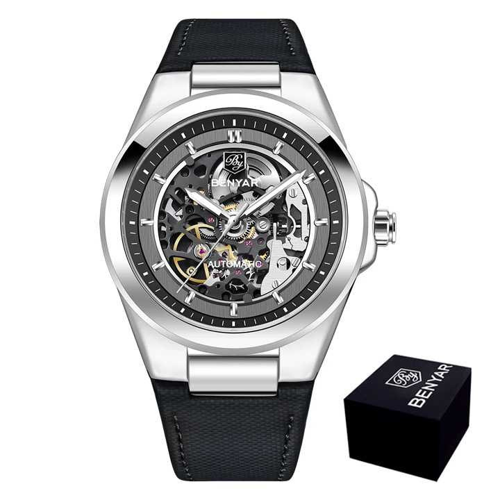 Benyar, механізм Механічний з автопідзаводом, корпус 42 х 42, матеріали Метал / Шкіра, колір Сріблястий / Чорний, форма Кругла, стиль Сasual, Класичний, індикація Стрілочний, тип кріплення Ремінець, водозахист 50 м, скло Мінеральне