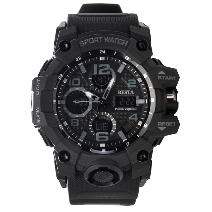 Besta, механізм Кварцовий, корпус 50х19, матеріали Полікарбонат / Каучуковий / Пластик, колір Чорний, форма Круглий, стиль Спортивний, індикація Комбінований (аналогово-стрілочний), тип кріплення Ремінець, скло Полікарбонатне