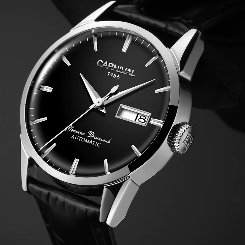 Carnival, механізм Механічний з автозаводом, корпус 38х14, матеріали Сталь вищої проби / Шкіряний / Метал, колір Сріблястий / Чорний, форма Круглий, стиль Класичний, індикація Аналоговий (стрілочний), тип кріплення Ремінець, скло Сапфірове
