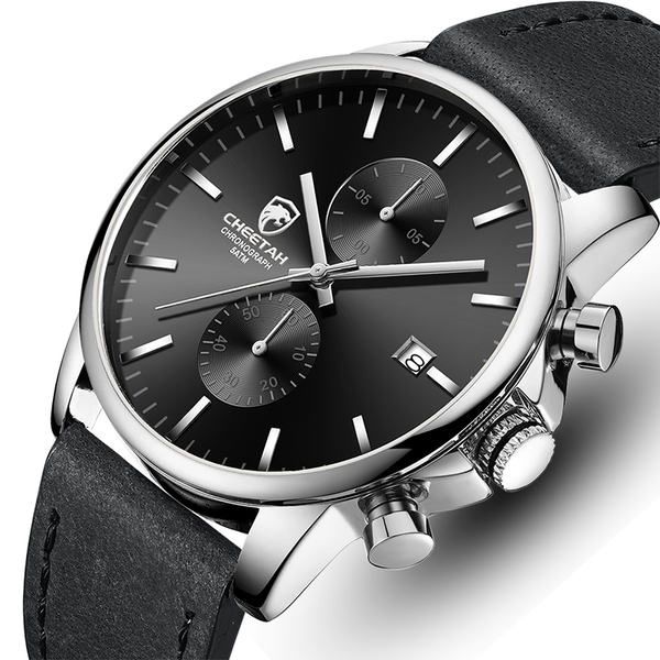 Cheetah, механізм Кварцовий, корпус 42х12, матеріали Сталь / Шкіряний / Метал, колір Сріблястий / Чорний, форма Круглий, стиль Класичний, індикація Аналоговий (стрілочний), тип кріплення Ремінець, скло Мінеральне