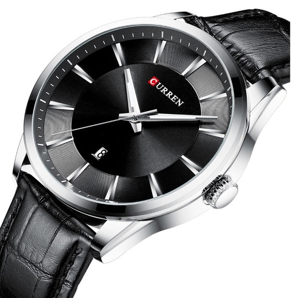 Curren, механізм Кварцовий, корпус 45х12, матеріали Сталь / Шкіряний / Метал, колір Сріблястий / Чорний, форма Круглий, стиль Класичний, індикація Аналоговий (стрілочний), тип кріплення Ремінець, скло Мінеральне