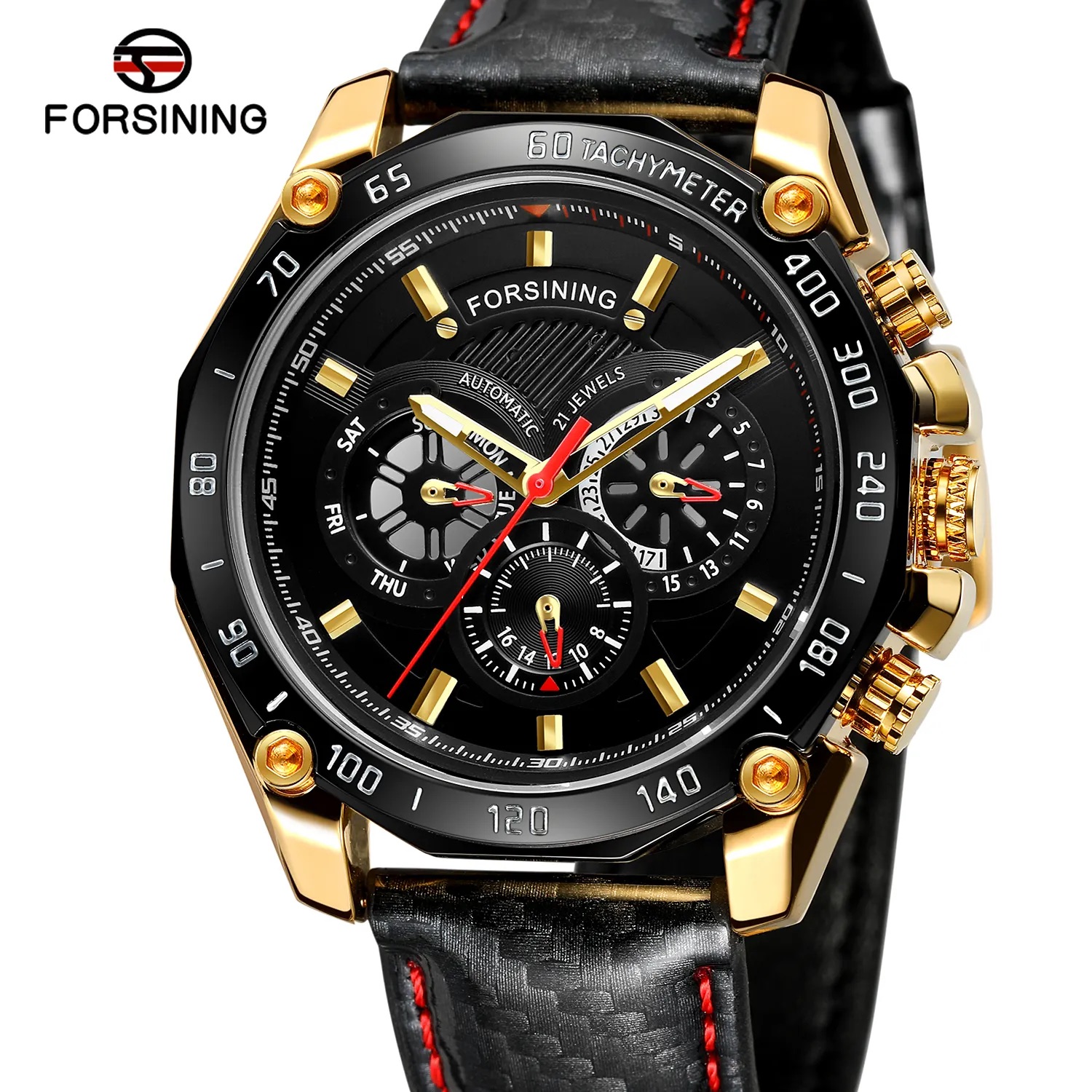 Forsining, механізм Механічний з автопідзаводом, корпус 45 х 45, матеріали Метал / Шкіра, колір Золотистий, форма Кругла, стиль Класичний, індикація Стрілочний, тип кріплення Ремінець, водозахист 30 м, скло Мінеральне