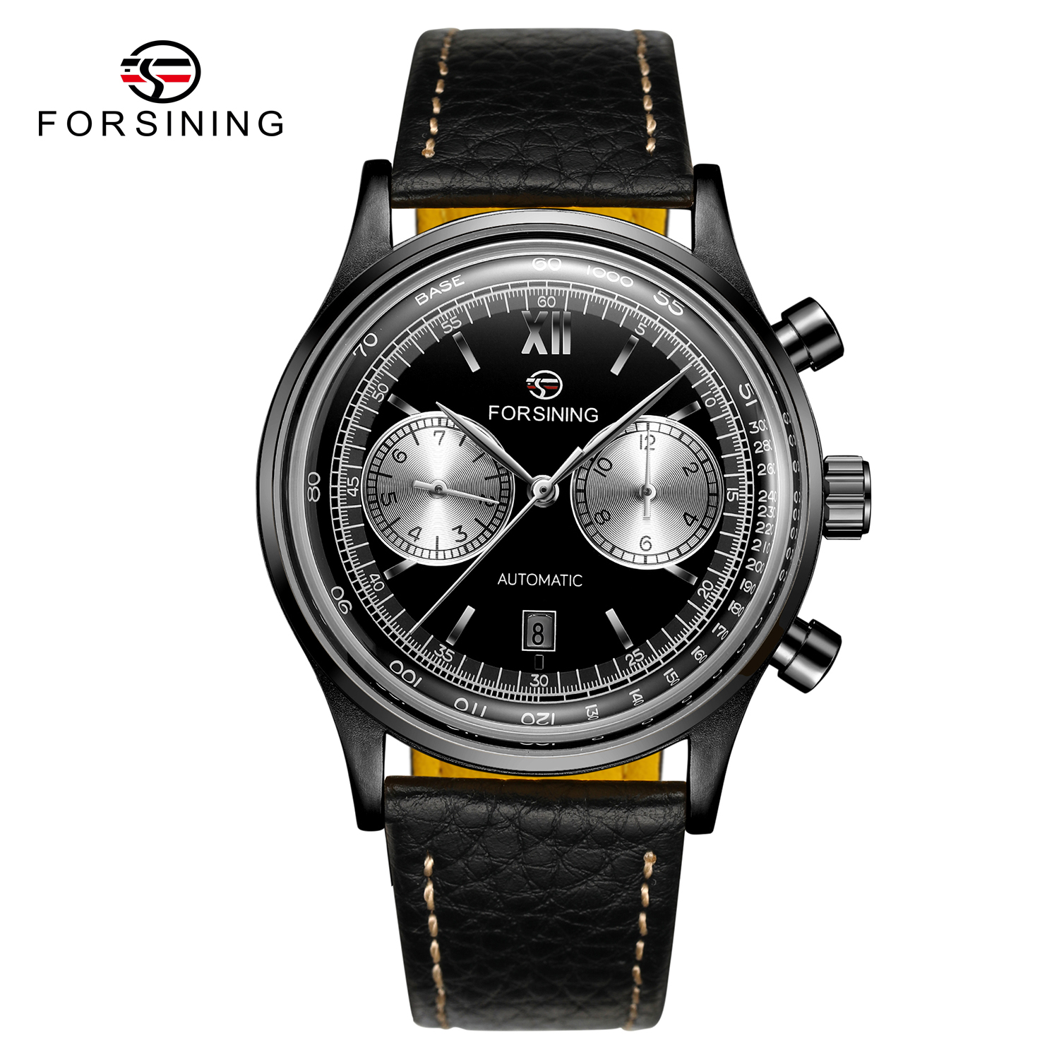 Forsining, механізм Механічний з автопідзаводом, корпус 42 х 42, матеріали Метал / Шкіра, колір Чорний, форма Кругла, стиль Класичний, індикація Стрілочний, тип кріплення Ремінець, водозахист 30 м, скло Мінеральне