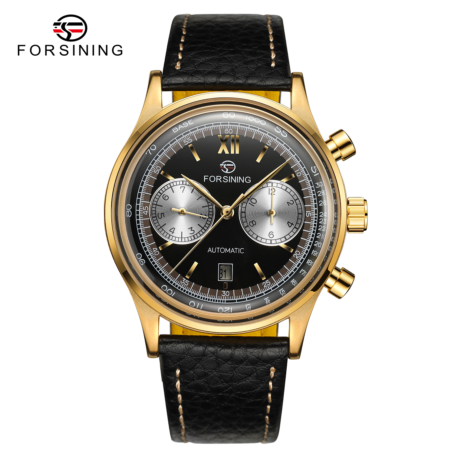 Forsining, механізм Механічний з автопідзаводом, корпус 42 х 42, матеріали Метал / Шкіра, колір Золотистий / Чорний, форма Кругла, стиль Класичний, індикація Стрілочний, тип кріплення Ремінець, водозахист 30 м, скло Мінеральне
