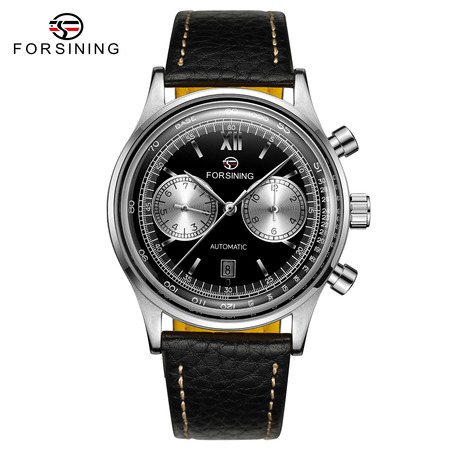 Forsining, механізм Механічний з автопідзаводом, корпус 42 х 42, матеріали Метал / Шкіра, колір Сріблястий / Чорний, форма Кругла, стиль Класичний, індикація Стрілочний, тип кріплення Ремінець, водозахист 30 м, скло Мінеральне