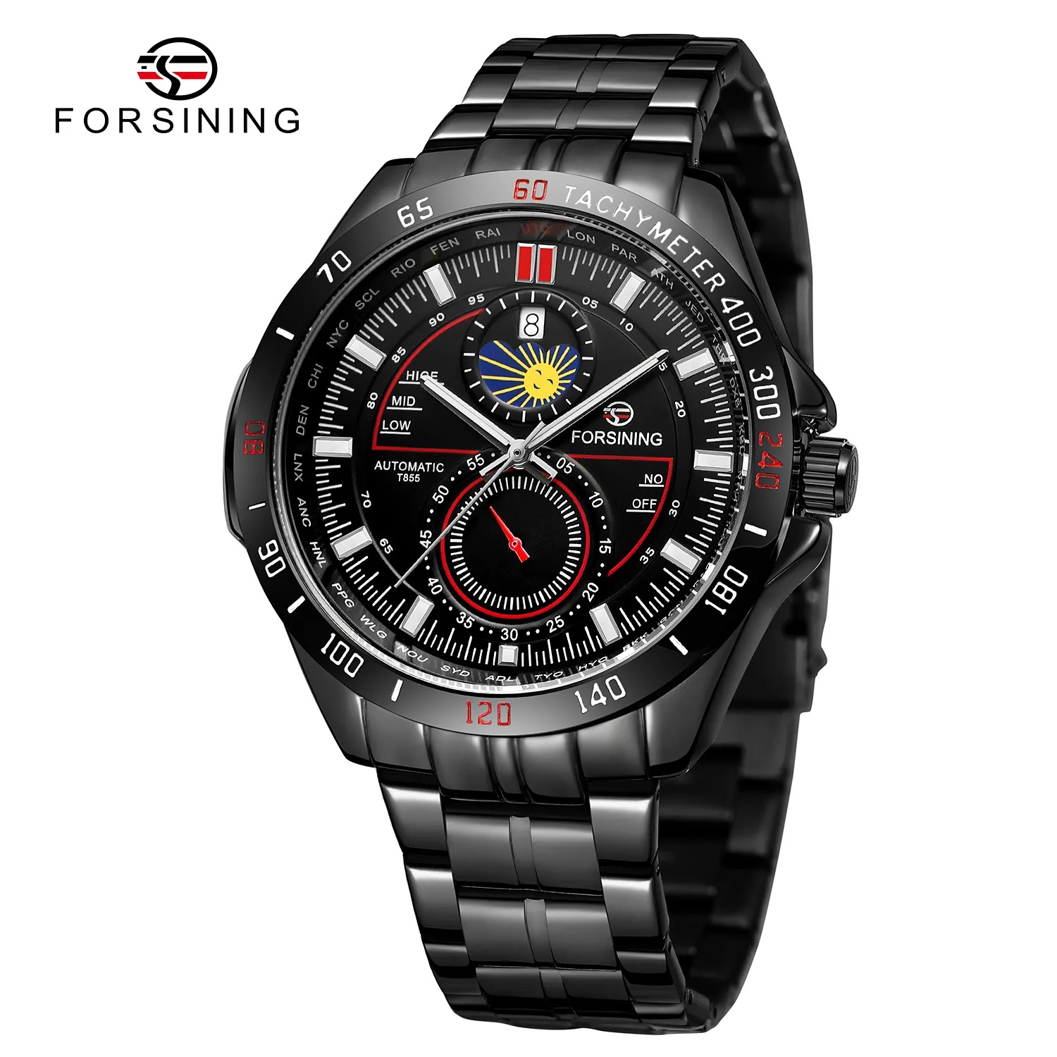 Forsining, механізм Механічний з автопідзаводом, корпус 44 х 44, матеріали Метал / Сталь, колір Чорний, форма Кругла, стиль Класичний, індикація Стрілочний, тип кріплення Браслет, водозахист 30 м, скло Мінеральне