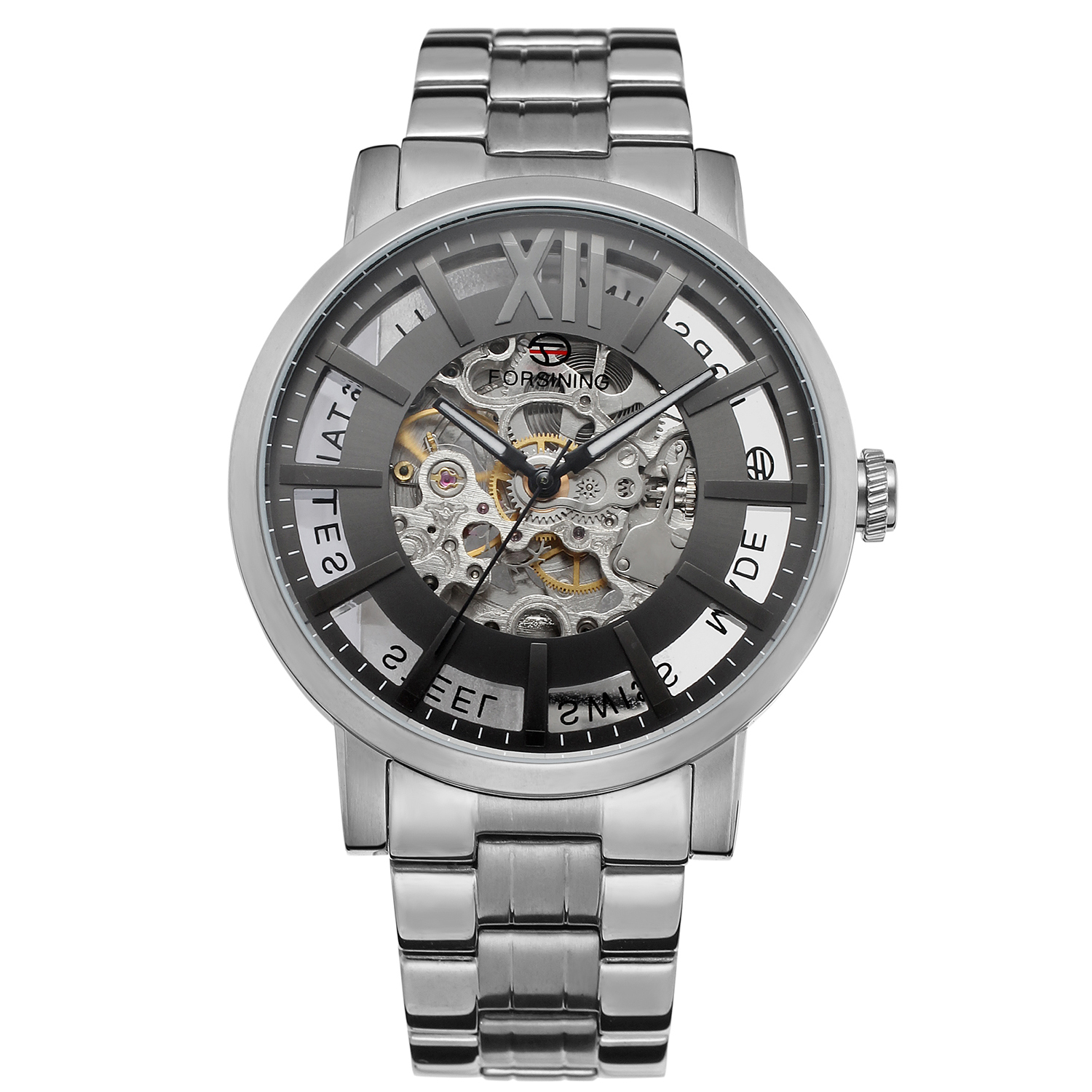 Forsining, механізм Механічні з автопідзаводом, корпус 43 х 43, матеріали Сталь, колір Сріблястий, форма Кругла, стиль Класичний, індикація Стрілочний, тип кріплення Браслет, водозахист 30 м, скло Мінеральне