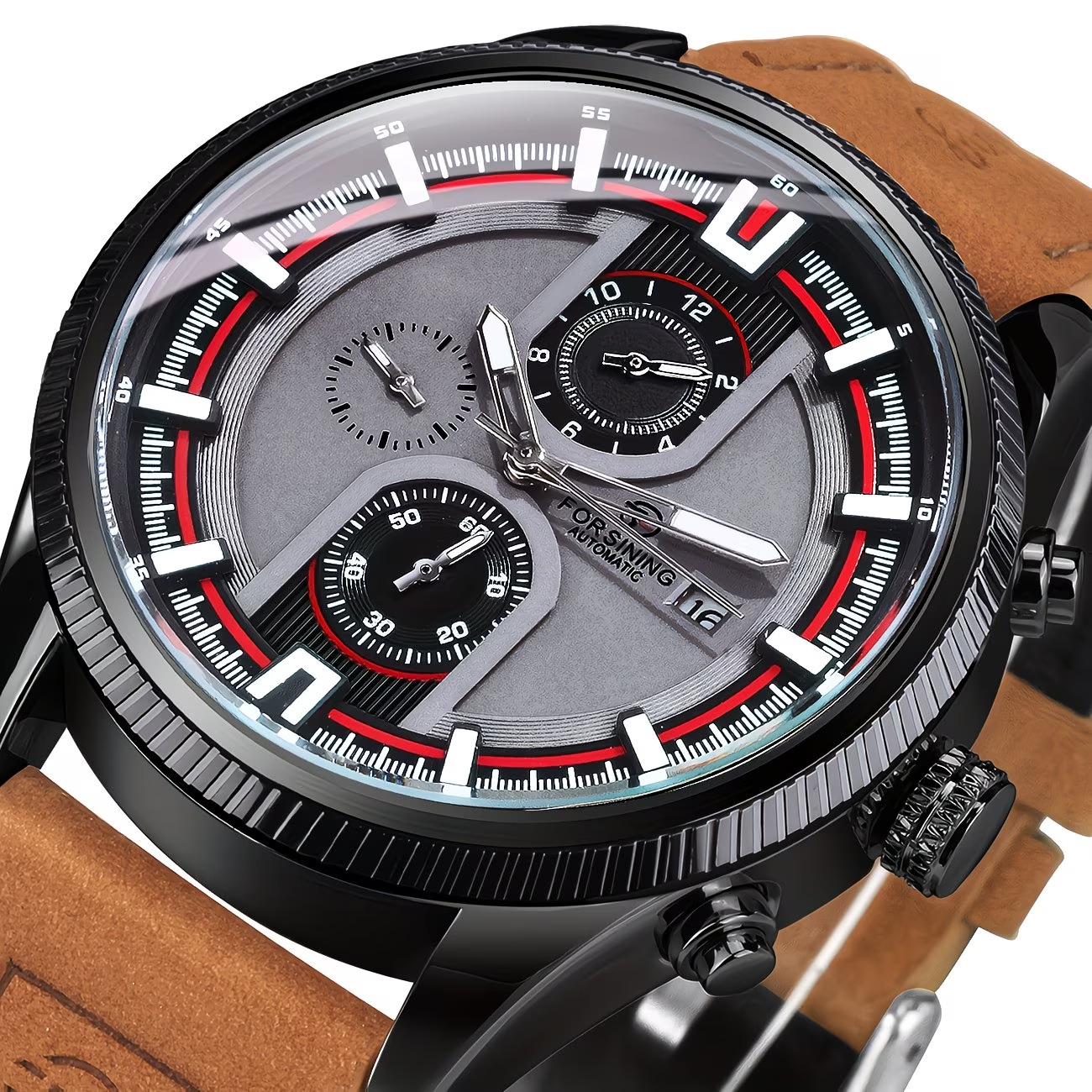 Forsining, механізм Механічний з автозаводом, корпус 44х16, матеріали Сталь / Шкіряний / Метал, колір Чорний / Коричневий, форма Круглий, стиль Класичний, індикація Аналоговий (стрілочний), тип кріплення Ремінець, скло Мінеральне