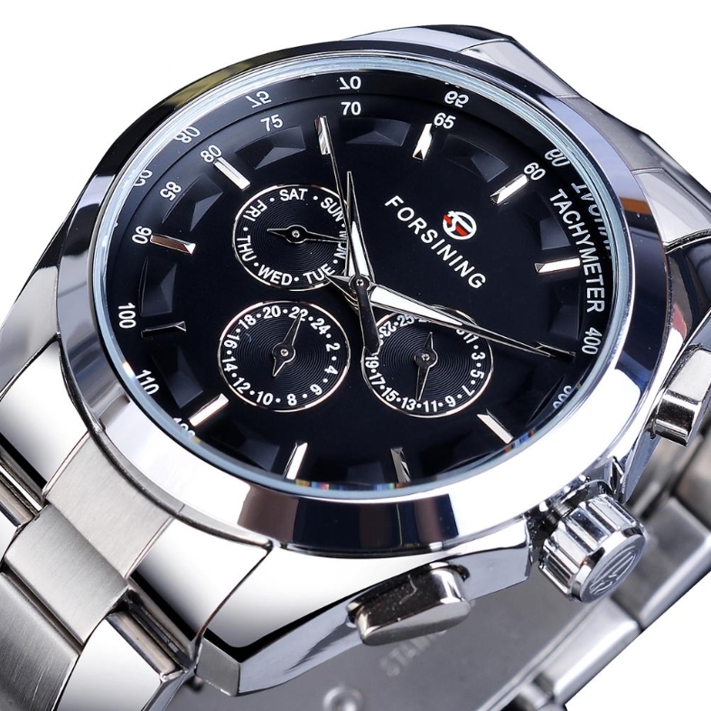 Forsining, механізм Механічний з автозаводом, корпус 42х14, матеріали Сталь / Сталевий / Метал, колір Сріблястий, форма Круглий, стиль Класичний, індикація Аналоговий (стрілочний), тип кріплення Браслет, скло Мінеральне
