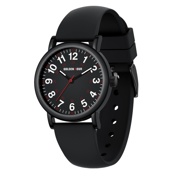 GoldenHour, механізм Кварцовий, корпус 38х9, матеріали Полікарбонат / Каучуковий / Пластик, колір Чорний, форма Круглий, стиль Класичний, індикація Аналоговий (стрілочний), тип кріплення Ремінець, скло Полікарбонатне