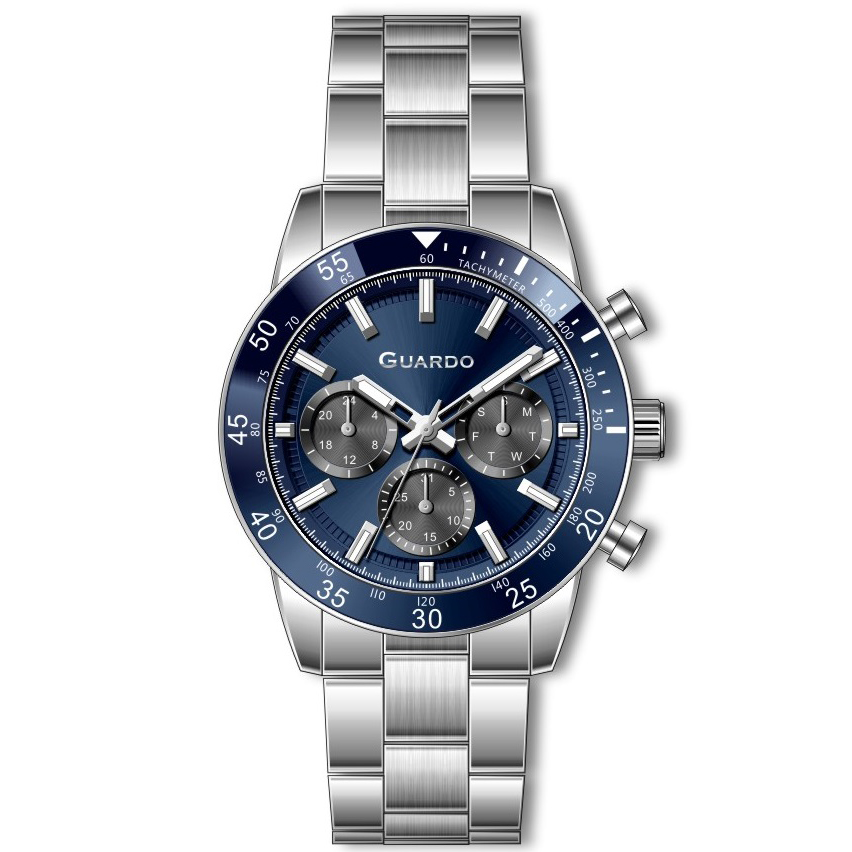 Guardo, механізм Кварцовий, корпус 44 х 10 х 52, матеріали Нержавіюча сталь, колір Синій / Сріблястий, форма Кругла, стиль Класичний, індикація Крапки, тип кріплення Браслет, водозахист 30 м, скло Мінеральне