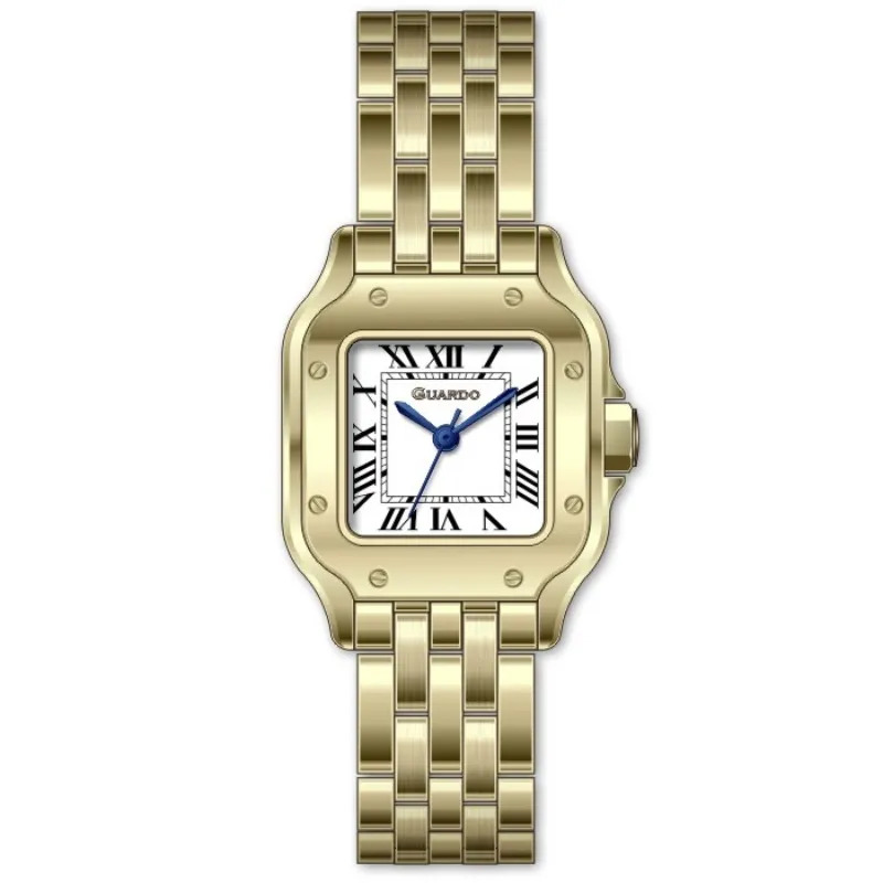 Guardo, механізм Кварцовий, корпус 26 х 21х 9, матеріали Нержавіюча сталь, колір Золотистий, форма Квадратна, стиль Класичний, індикація Римські цифри, тип кріплення Браслет, водозахист 30 м, скло Мінеральне
