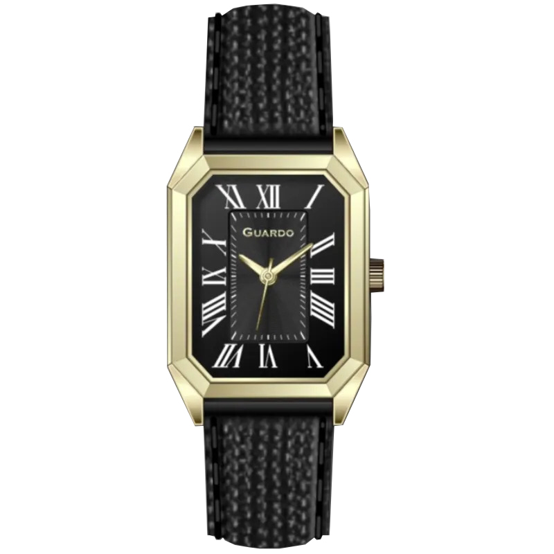 Guardo, механізм Кварцовий, корпус 29 х 21 х 8, матеріали Нержавіюча сталь / Шкіра, колір Золотистий / Чорний, форма Прямокутна, стиль Класичний, індикація Римські цифри, тип кріплення Ремінець, водозахист 30 м, скло Мінеральне