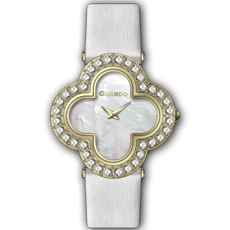 Guardo, механізм Кварцовий, корпус 31 х 31 х 8, матеріали Нержавіюча сталь / Шкіра, колір Золотистий / Білий, форма Нестандартна форма, стиль Класичний, індикація Без міток, тип кріплення Ремінець, водозахист 30 м, скло Мінеральне