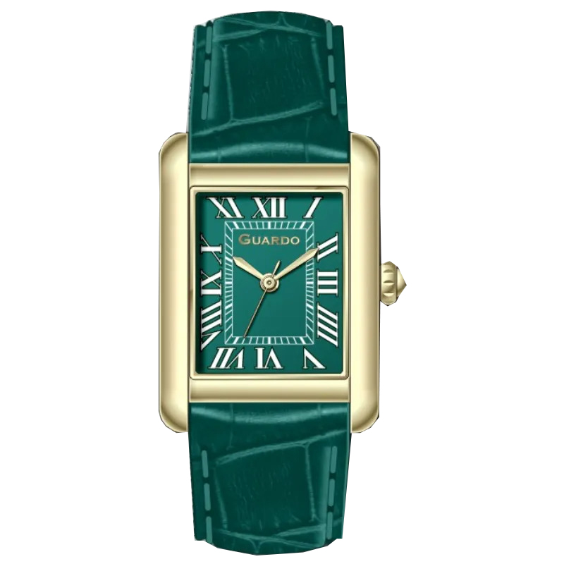Guardo, механізм Кварцовий, корпус 35 х 21 х 7, матеріали Нержавіюча сталь / Шкіра, колір Золотистий / Чорний, форма Прямокутна, стиль Класичний, індикація Римські цифри, тип кріплення Ремінець, водозахист 30 м, скло Мінеральне