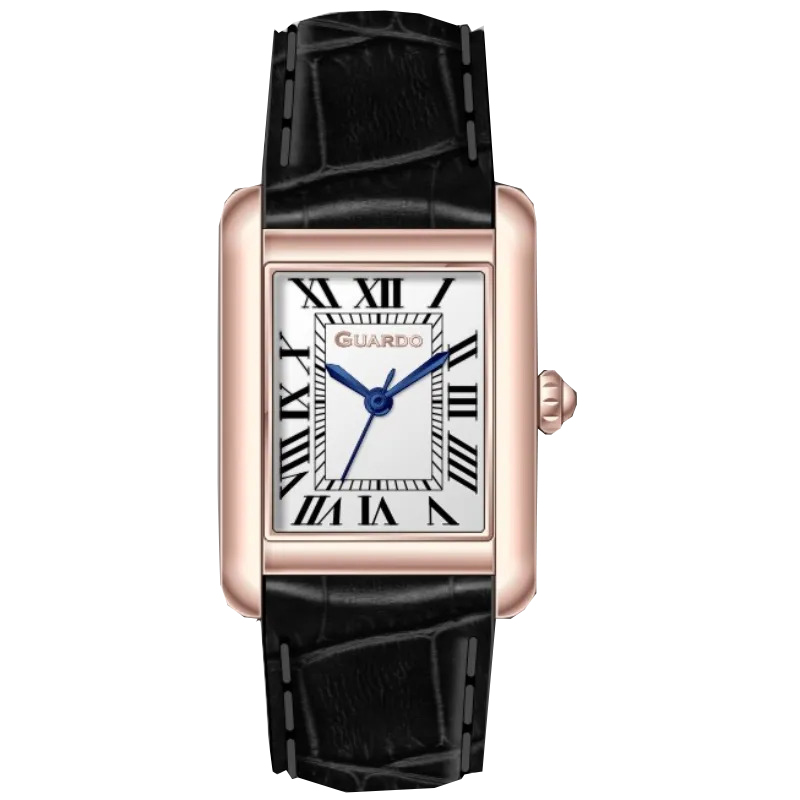 Guardo, механізм Кварцовий, корпус 35 х 21 х 7, матеріали Нержавіюча сталь / Шкіра, колір Рожевий / Чорний, форма Прямокутна, стиль Класичний, індикація Римські цифри, тип кріплення Ремінець, водозахист 30 м, скло Мінеральне