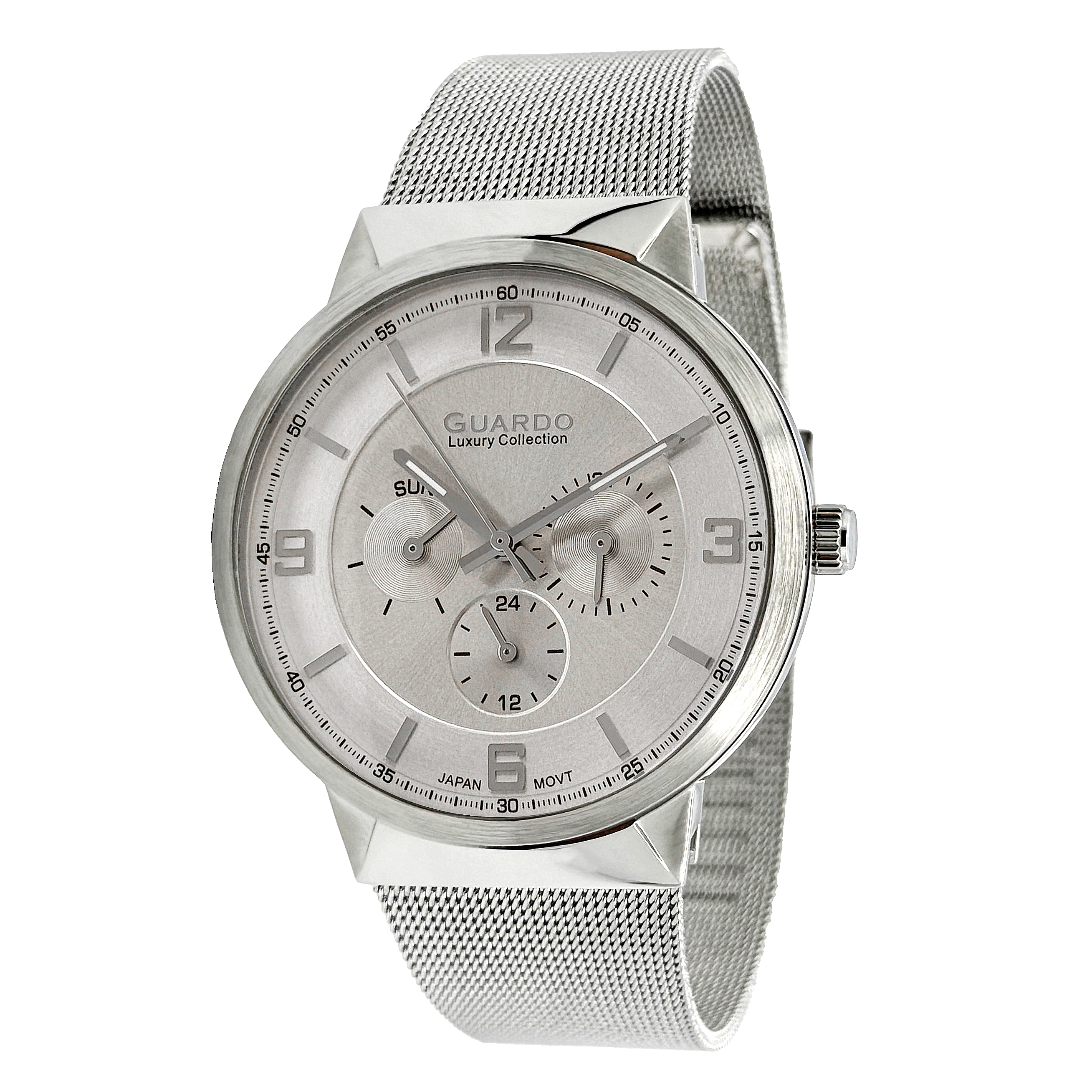 Guardo, механізм Кварцовий, корпус 47 х 42 х 10, матеріали Нержавіюча сталь, колір Сріблястий, форма Кругла, стиль Класичний, індикація Індекси, Арабські цифри, тип кріплення Браслет, водозахист 30 м, скло Мінеральне