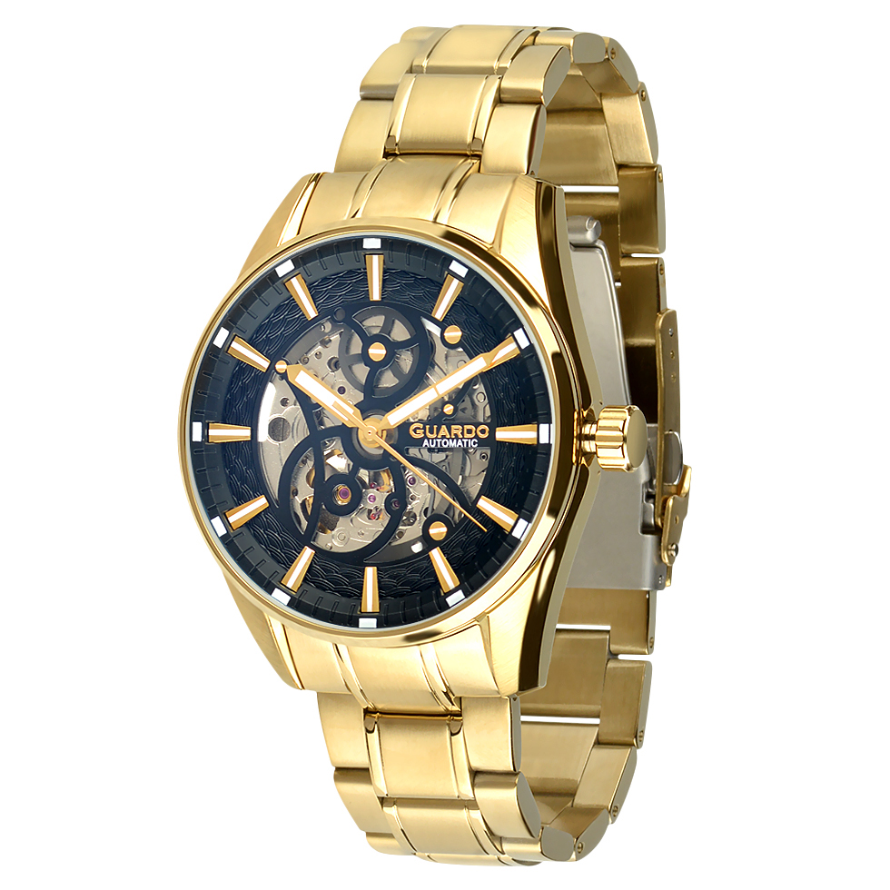 Guardo, механізм Кварцовий, корпус 44 Х 57 Х 15, матеріали Нержавіюча сталь, колір Золотистий, форма Кругла, стиль Класичний, індикація Індекси, тип кріплення Браслет, водозахист 50 м, скло Мінеральне