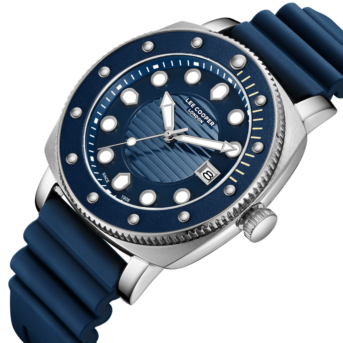 Lee Cooper, механізм Кварцовий, корпус 43х11, матеріали Сталь / Каучуковий / Метал, колір Сріблястий / Синій, форма Круглий, стиль Класичний, індикація Аналоговий (стрілочний), тип кріплення Ремінець, скло Мінеральне