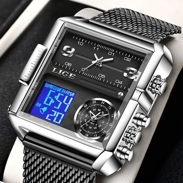 Lige, механізм Кварцовий, корпус 42х40х13, матеріали Сталь / Сталевий / Метал, колір Сріблястий / Чорний, форма Прямокутний, стиль Спортивний, індикація Комбінований (аналогово-стрілочний), тип кріплення Браслет, скло Мінеральне