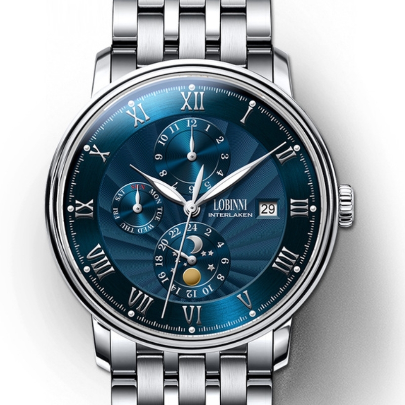 Lobinni, механізм Механічний з автозаводом, корпус 40х13, матеріали Сталь вищої проби / Сталевий / Метал, колір Сріблястий, форма Круглий, стиль Класичний, індикація Аналоговий (стрілочний), тип кріплення Браслет, скло Сапфірове
