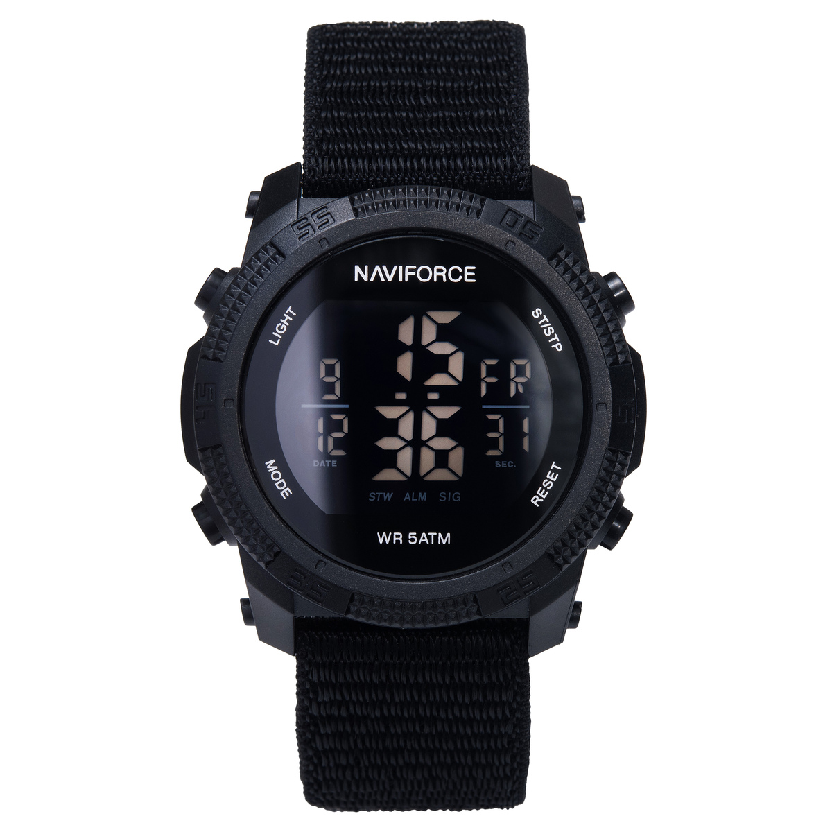 Naviforce, механізм Кварцовий, корпус 45х14, матеріали Полікарбонат / Каучуковий / Пластик, колір Чорний, форма Круглий, стиль Спортивний, індикація Цифровий (електронний), тип кріплення Ремінець, скло Полікарбонатне