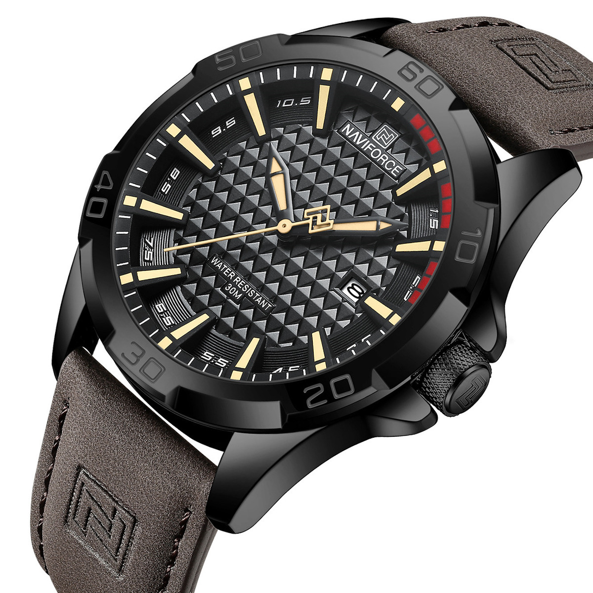 Naviforce, механізм Кварцовий, корпус 45х12,5, матеріали Сталь / Шкіряний / Метал, колір Чорний / Коричневий, форма Круглий, стиль Класичний, індикація Аналоговий (стрілочний), тип кріплення Ремінець, скло Мінеральне