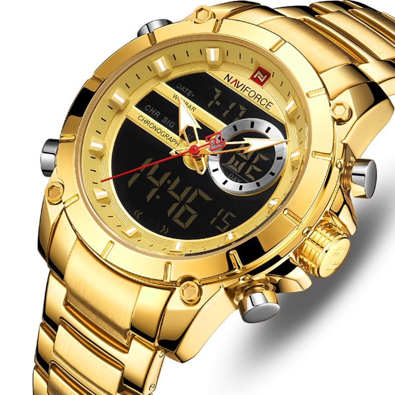 Naviforce, механізм Кварцовий, корпус 43,5х15,5, матеріали Сталь / Сталевий / Метал, колір Золотистий, форма Круглий, стиль Спортивний, індикація Комбінований (аналогово-стрілочний), тип кріплення Браслет, скло Мінеральне