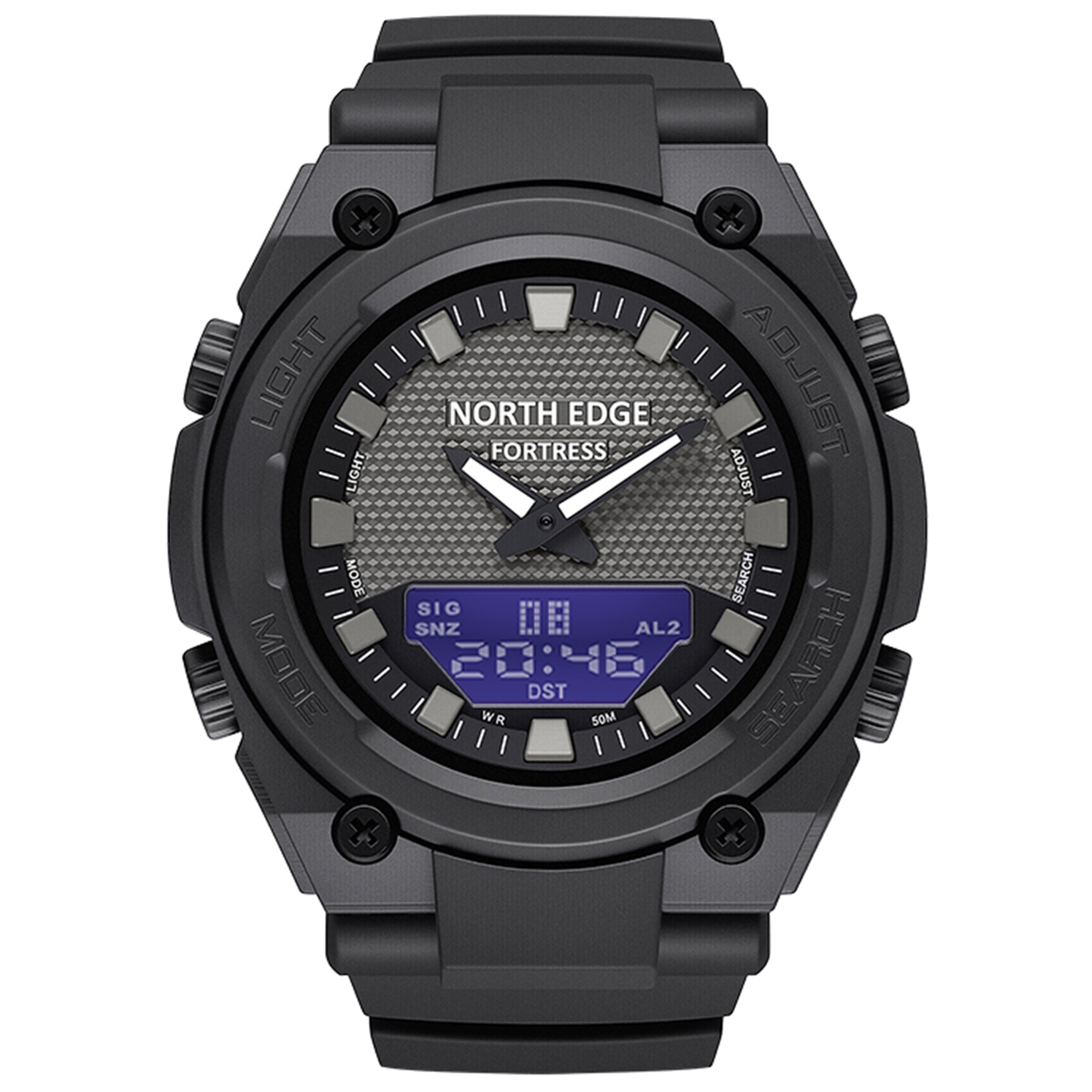 North Edge, механізм Кварцовий, корпус 46,1х15,4, матеріали Сталь / Каучуковий / Метал, колір Чорний, форма Круглий, стиль Спортивний, індикація Комбінований (аналогово-стрілочний), тип кріплення Ремінець, скло Мінеральне