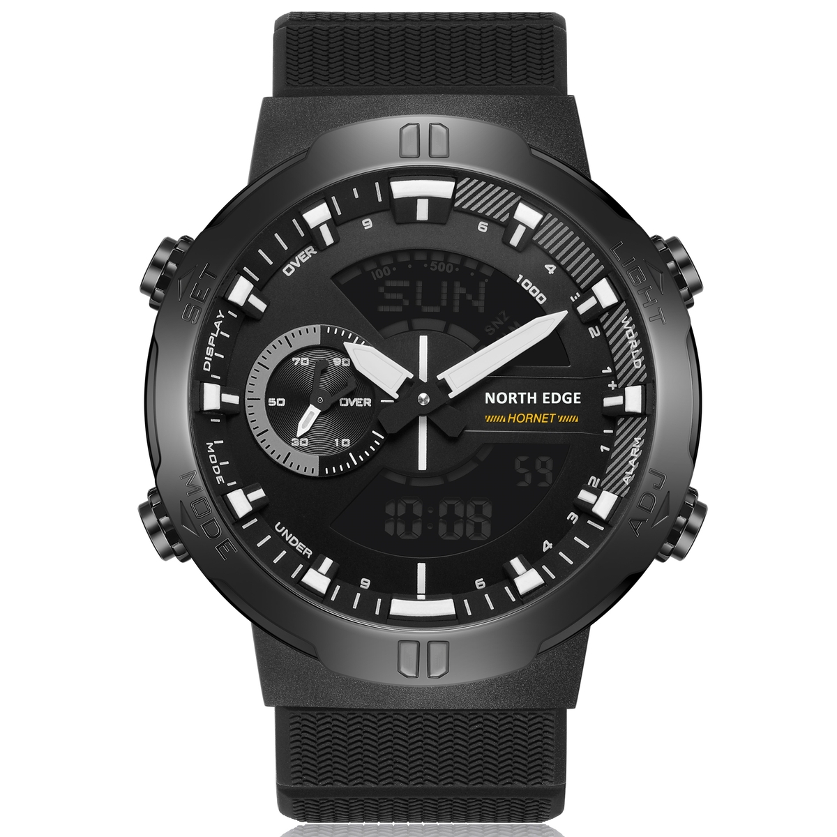 North Edge, механізм Кварцовий, корпус 45х15, матеріали Сталь / Каучуковий / Метал, колір Чорний, форма Круглий, стиль Спортивний, індикація Комбинированный (аналогово-стрелочный), тип кріплення Ремінець, скло Мінеральне